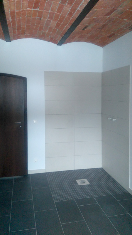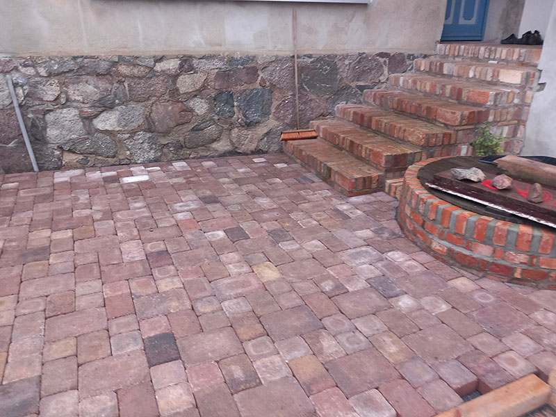 Fliesenarbeiten im Bad und verlegen eines Backsteinfußbodens