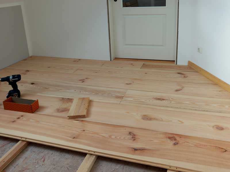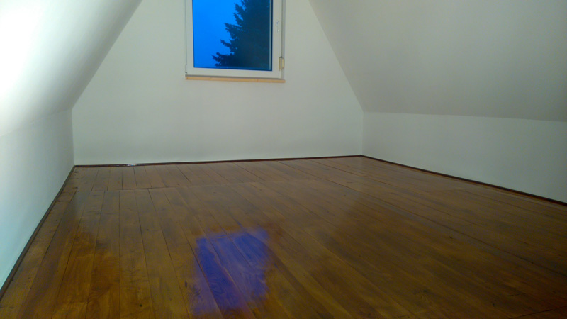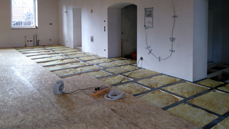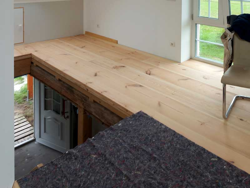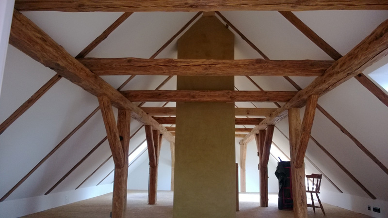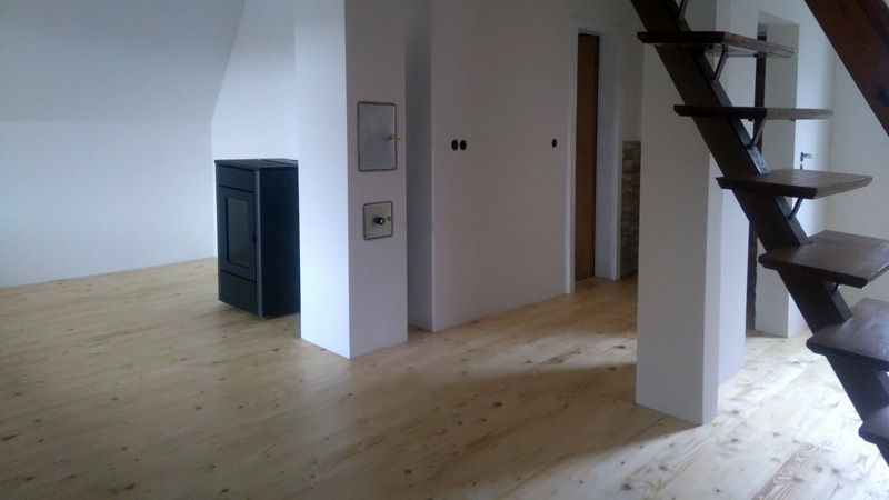 Zwischenergebnis: Dachgeschossausbau, sichtbare Holzkonstruktion wurde geschliffen, Giebel und Zwischensparrenflächen gedämmt und mit Trockenbauplatten verkleidet