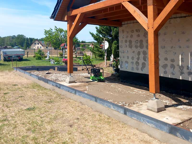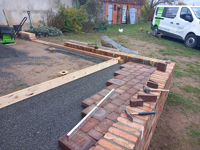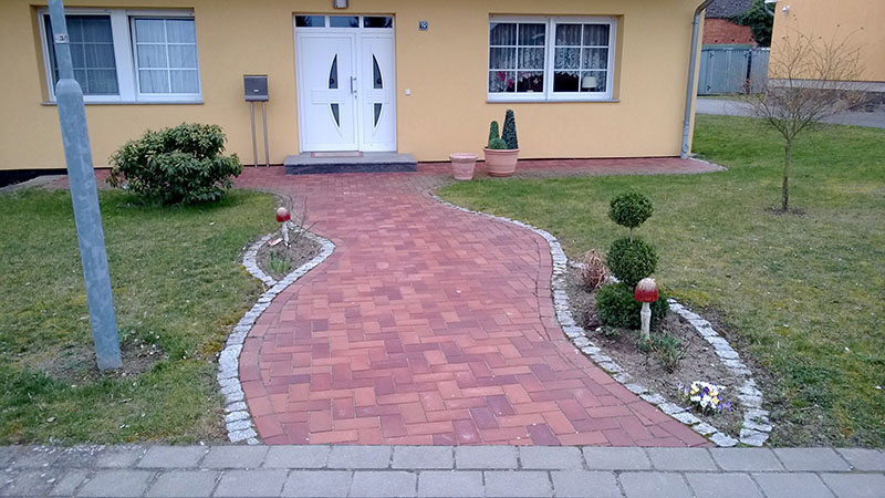 Herstellung eines geschwungenen Gehweges mit Pflasterklinkern im Fischgrätenverband, Randeinfassung mit Granitquadern und Ausarbeitung von Pflanzflächen