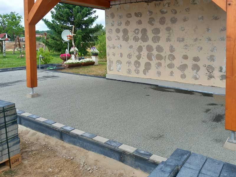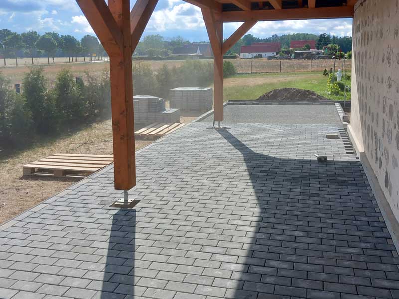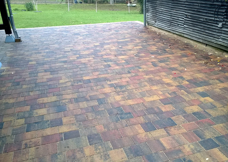 fertig gepflasterte Terasse mit Großpflaster "Herbstlaub" im wilden Verband