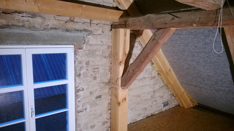 Vorher: Dachgeschossausbau, Blick auf Ecke Giebel/ Dachfläche mit sichtbarer Balkenkonstruktion