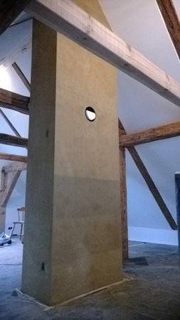 Nachher: verputzter Schornstein mit Lehmputz und Anschluß für einen Kamin