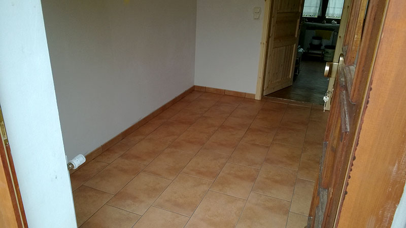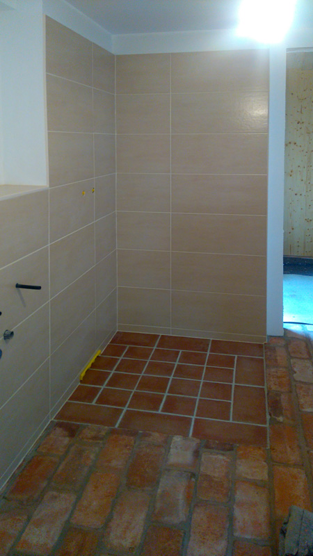 Fliesenarbeiten im Bad und verlegen eines Backsteinfußbodens