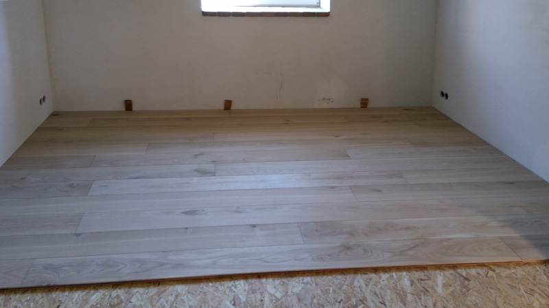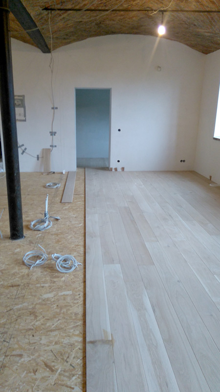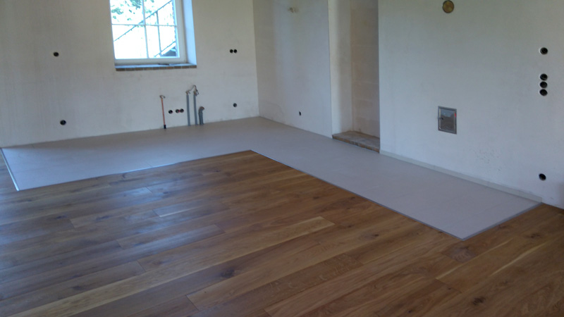 Verlegen von Fliesen für den Kochbereich mit Übergang zum Echtholzfußboden