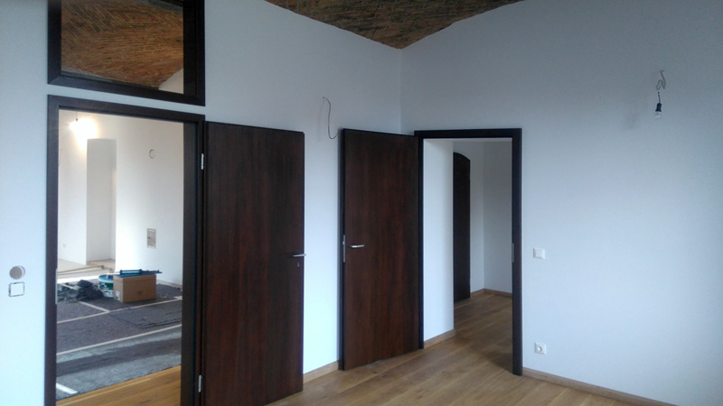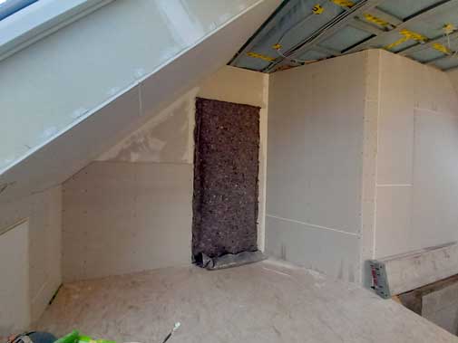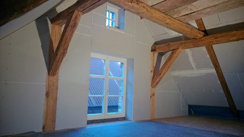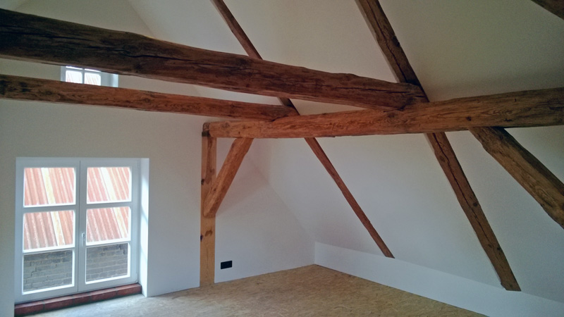 Zwischenergebnis: Dachgeschossausbau, sichtbare Holzkonstruktion wurde geschliffen, Giebel und Zwischensparrenflächen gedämmt und mit Trockenbauplatten verkleidet
